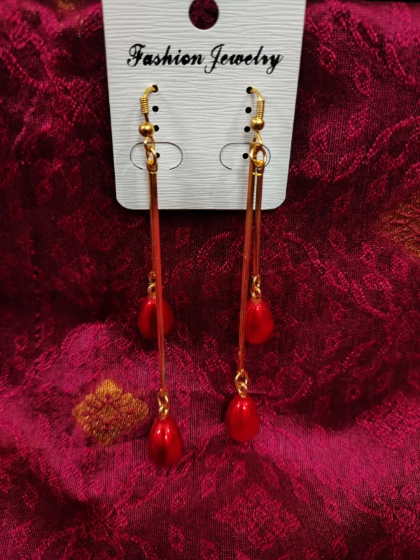 Long Gold Bar Dangle Earrings with Red Teardrop