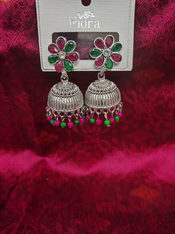 Oxidized Silver Floral Jhumka Earrings with Pink and Green Stones