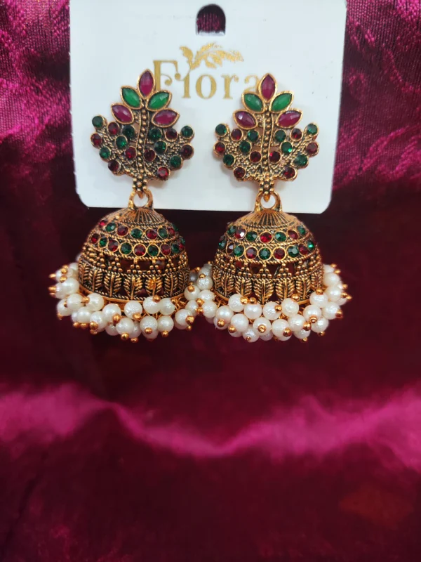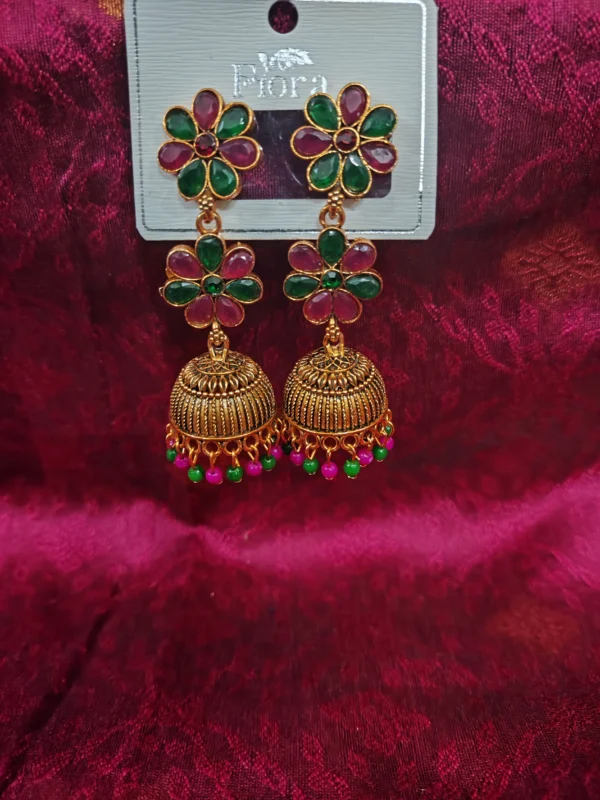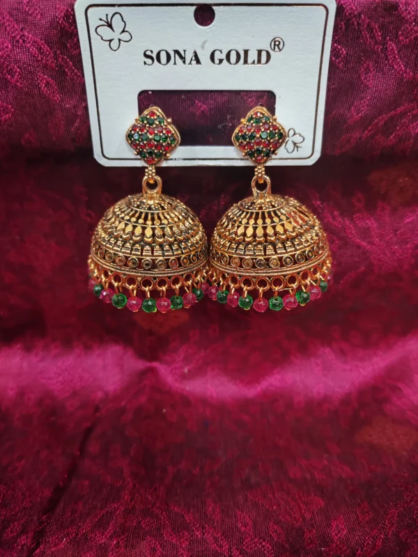 Gold Tone Jhumka Earrings with Red and Green Stone