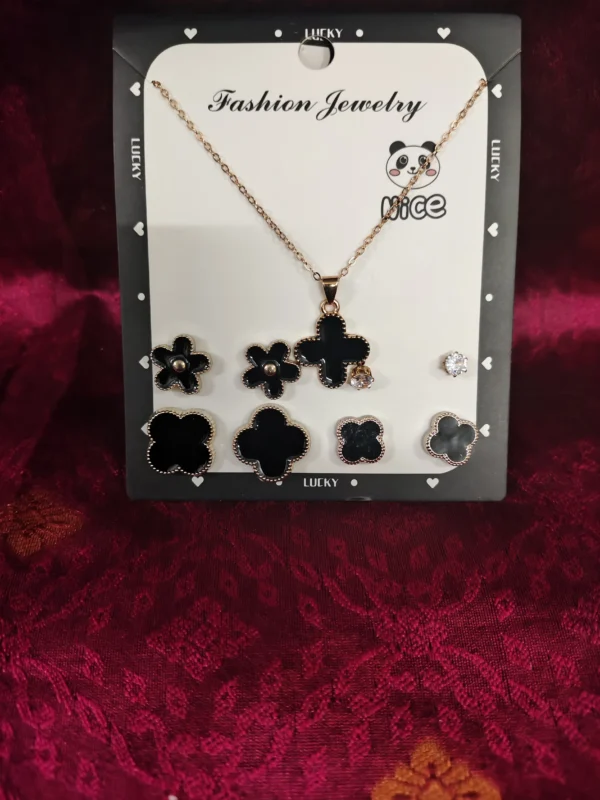 6 Piece Black Enamel Clover and Floral Earring Set with Matching Necklace and Earring