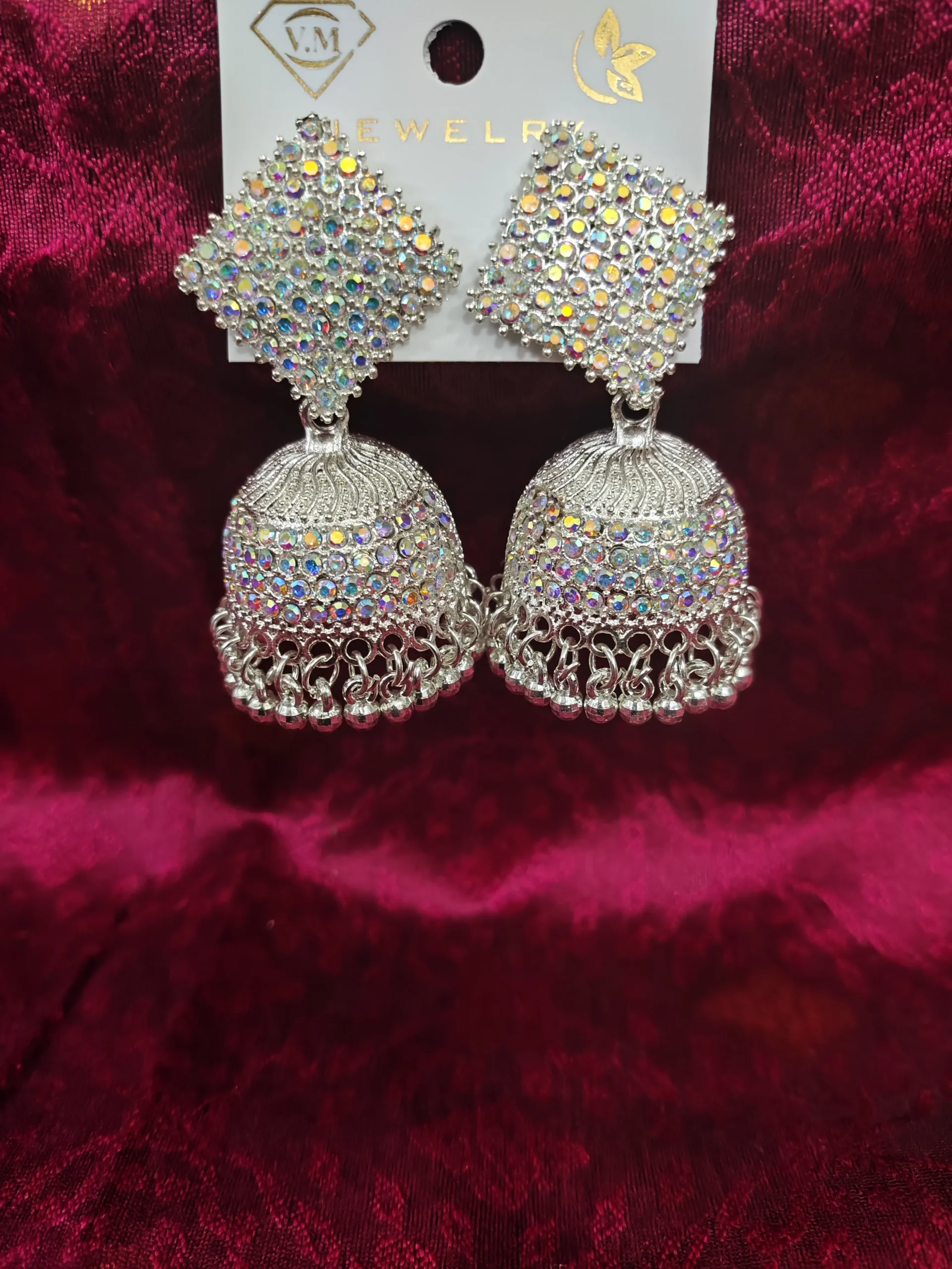 Tone Iridescent Crystal Jhumka Earrings with Diamond Stud